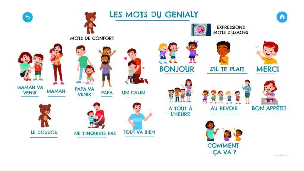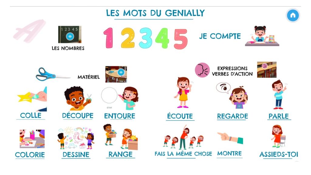 Il fallait trouver un outil intuitif et interactif, qui ludifie l’apprentissage du français en faisant des ponts avec les langues et cultures de la classe. Genially semblait être l’outil idéal pour concevoir un glossaire parce qu’il permet de concevoir une interface dynamique, avec des illustrations qui représentent tous les élèves, qui donne envie de découvrir et de passer du temps autour du plurilinguisme. L’outil a été co-construit avec les enseignants et les Atsem puis avec les enseignants-chercheures grâce à des réunions avec les équipes sur le terrain, et des temps d’observation en classe (5 réunions formelles sur 2 ans, et de nombreux échanges informels). Des discussions ont permis de choisir le contenu du glossaire (nombres, mots de rituel, mots et phrases de confort, langues) et de choisir la structuration de pages donnant des informations sur les langues (et non pas sur les pays, car les deux ne se confondent pas). La création des enregistrements audio (correspondant aux traductions des mots proposés) repose principalement sur l’implication des familles ayant répondu à la demande des enseignants. Les parents volontaires ont fourni la traduction des mots dans les langues qu’ils connaissaient. Ont aussi participé aux enregistrements plusieurs étudiants de l’INSPE de l’académie de Normandie. L’outil a pu être amélioré au fil de la recherche pour le rendre plus adapté au contexte des classes (choix des langues, choix du lexique, choix des formulations) et plus ergonomique (le son, le visuel, la facilité d’utilisation pour un enfant, l’arborescence générale).