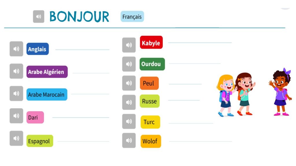 Des traductions et des fiches « découverte » des langues suivantes: anglais, arabe algérien, arabe marocain, dari, espagnol, français, kabyle, ourdou, peul, russe, turc, wolof. Les mots suivants:
